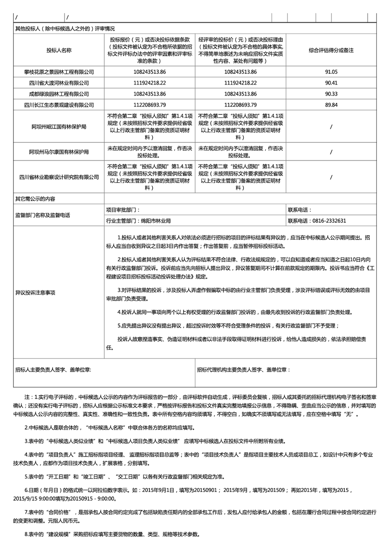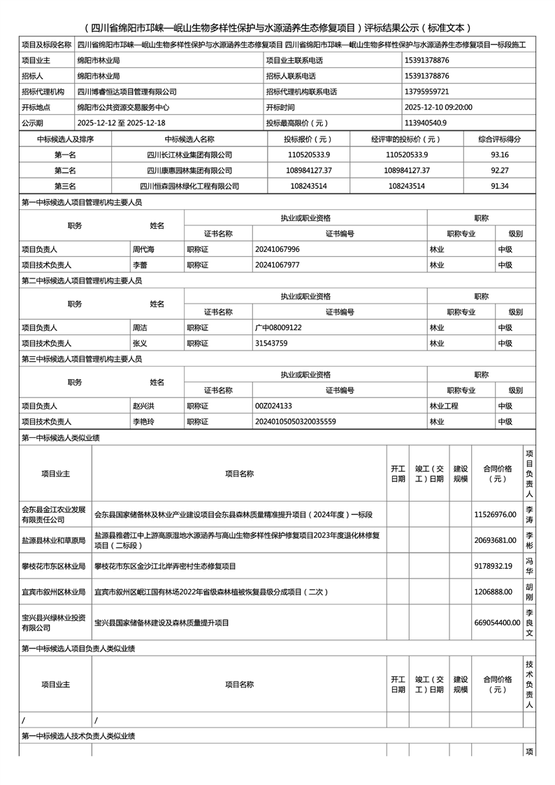 四川省绵阳市邛崃一岷山生物多样性保护与水源涵养生态修复项目评标结果公示(一标段)