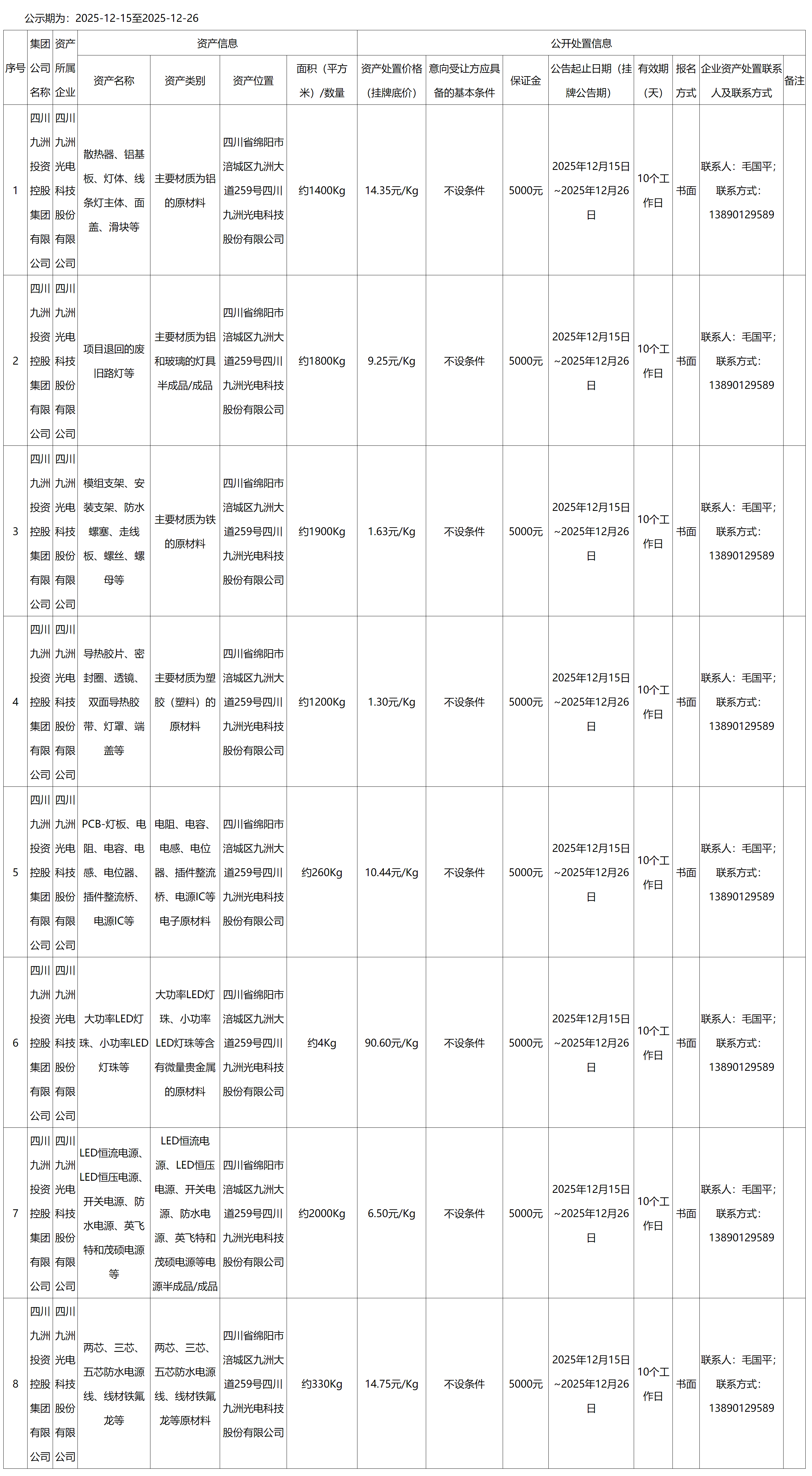 四川九洲光电科技股份有限公司电子料、散热器等积压存货处置公告