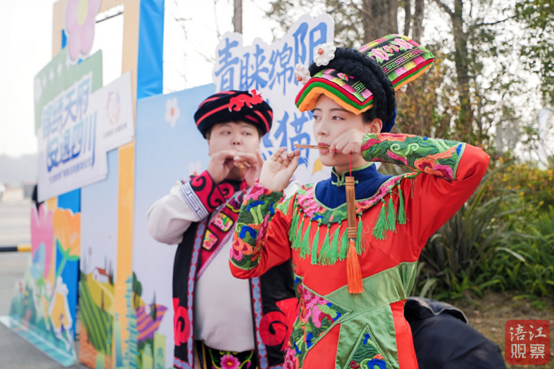 在民族风情区,身穿民族服装的汉子吹羌笛、花帽姑娘转绣球,背景“青睐绵阳 熊猫家园”立牌与服饰相映成趣。“没想到乡村不仅有景,还有这么浓的文化味儿!”一位游客边拍视频边感叹。