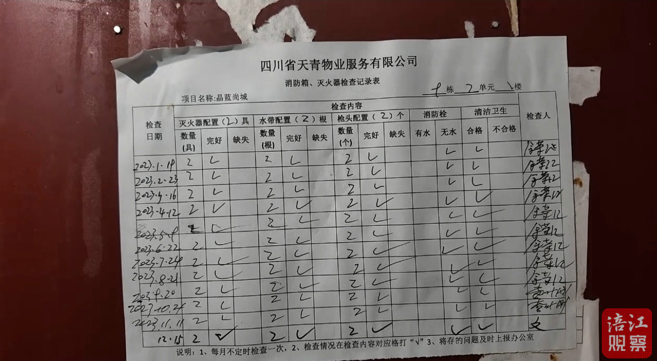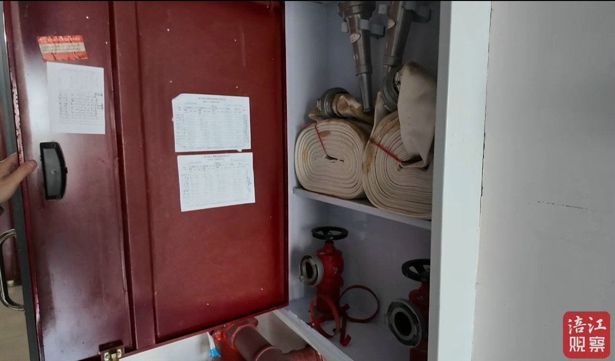 记者实地查验发现,该小区消火栓内的消防水管崭新,无使用痕迹,打开后却没有水流。而消火栓上张贴的物业巡查台账显示,早在2023年,该问题已被标注。