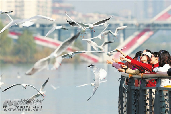 游客打卡三江半岛,与红嘴鸥互动嬉戏。
