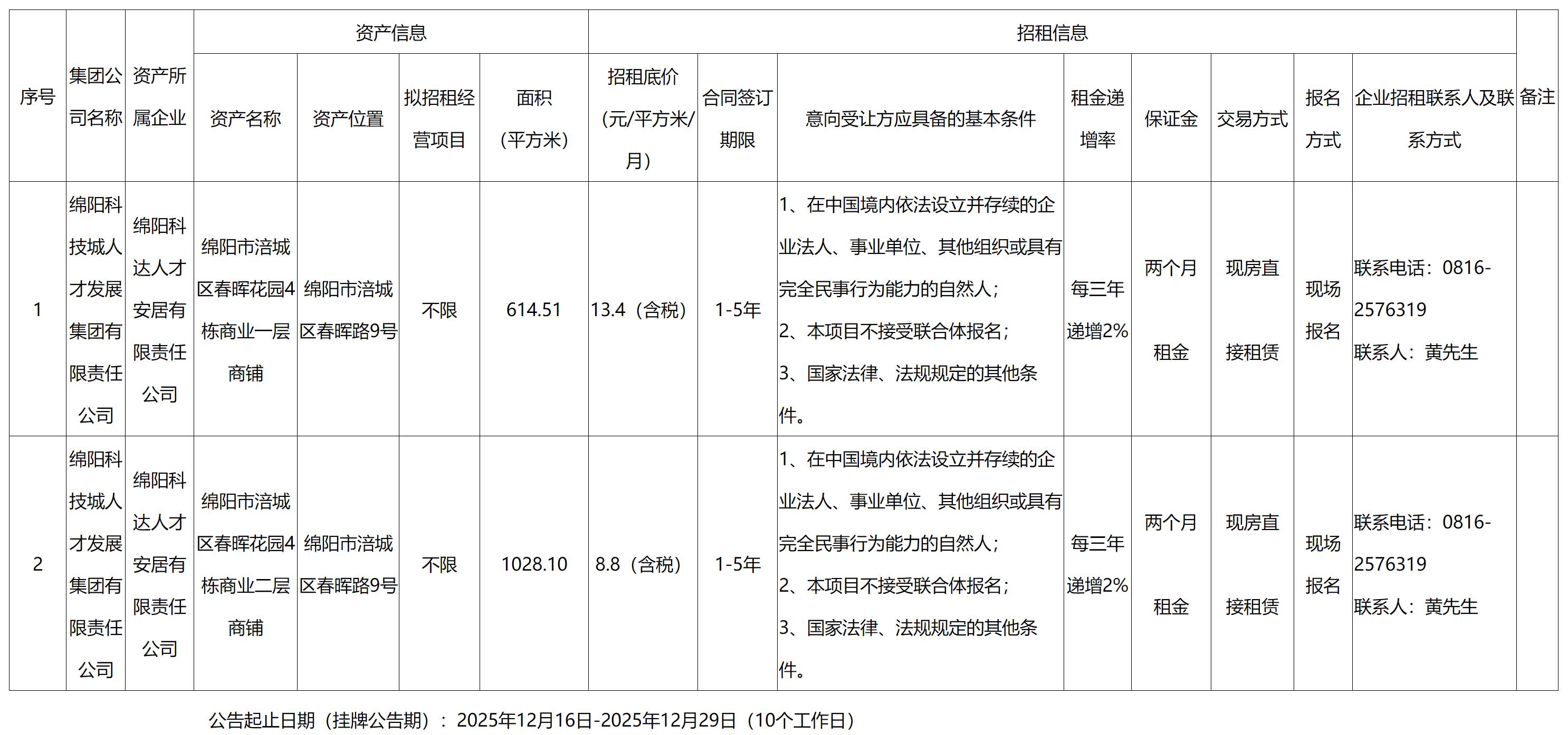 绵阳科达人才安居有限责任公司春晖花园商铺出租公告