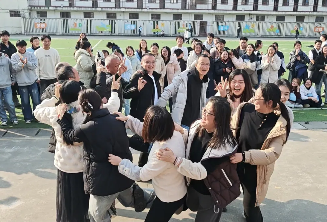 活动现场,师生全员投入游戏,欢声笑语充盈整个操场。班主任化身“鸡妈妈”全力守护学生,老师们组队参与滚铁环、编花篮活动,生疏却默契的动作间,尽显课堂之外的亲和与活力。这场亲切的互动,不仅有效拉近了师生距离,更让备考学子真切感受到“我们始终同行”的温暖与力量。