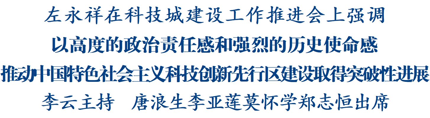 绵阳新闻网讯 12月19日,科技城建设工作推进会召开,省委常委、市委书记、科技城党工委第一书记左永祥出席会议并讲话。他强调,要深入学习贯彻习近平总书记关于科技创新的重要论述和对四川对绵阳工作系列重要指示精神,认真落实党中央、国务院和省委、省政府有关决策部署,牢记嘱托、勇担使命,以高度的政治责任感和强烈的历史使命感,扎实做好科技城建设管理体制机制改革“后半篇文章”,高水平建设中国(绵阳)科技城,奋力推动中国特色社会主义科技创新先行区建设取得突破性进展。
