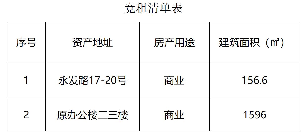 绵阳市高新粮油购销有限公司所属资产位于永兴镇永发路17至20号门面和原办公楼二三楼面向社会进行公开竞价招租(详见竞租清单表),现将有关事宜公告如下: