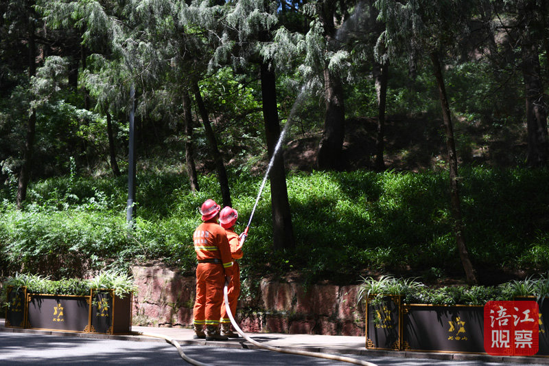 七曲山专职消防救援站消防员对翠云廊古柏进行人工降温增湿作业。涪江观察记者 刘晓东 蒋成林摄