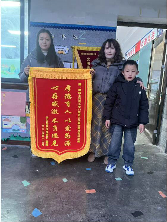 绵阳新闻网讯 近日,一面绣着“厚德育人,以爱为源,心存感激,不负遇见”的锦旗,由彭秋深同学家长专程送至安州区河清小学,赠予二⑶班班主任秦骏秋老师。这十六个熠熠生辉的金色大字,不仅承载着家长对老师的深厚谢意,更凝聚着一段以真诚沟通浇灌、以双向理解培育的温暖教育历程。