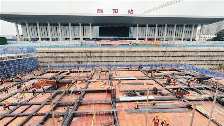 绵阳火车站站前广场北侧2区段主体结构顺利封顶。 记者 唐韬 摄