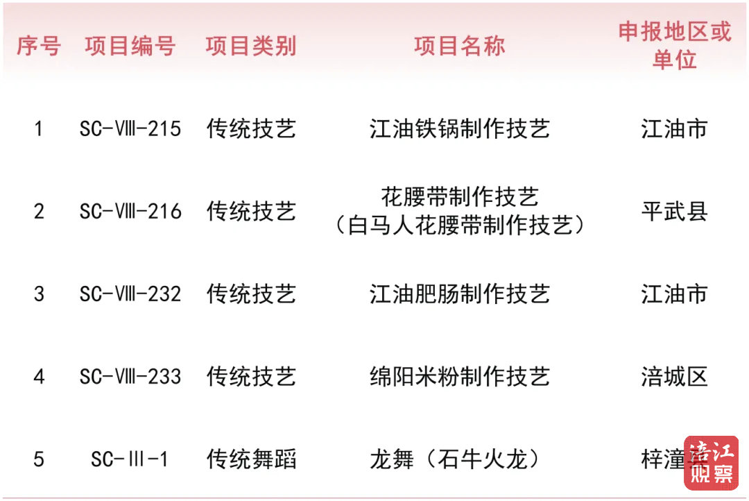 此次入选的5个非遗项目涵盖了传统技艺和传统舞蹈门类,生动体现了绵阳文化独特魅力,分别为:江油铁锅制作技艺、花腰带制作技艺(白马人花腰带制作技艺)、江油肥肠制作技艺、绵阳米粉制作技艺以及龙舞(石牛火龙)。