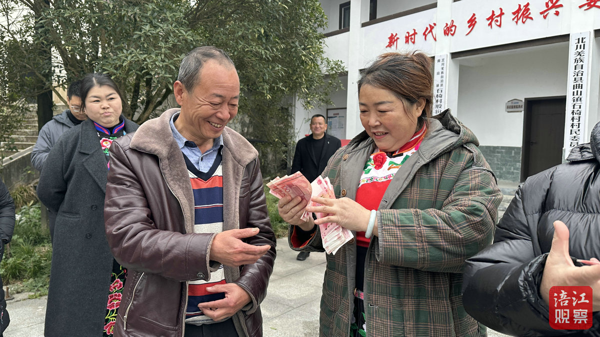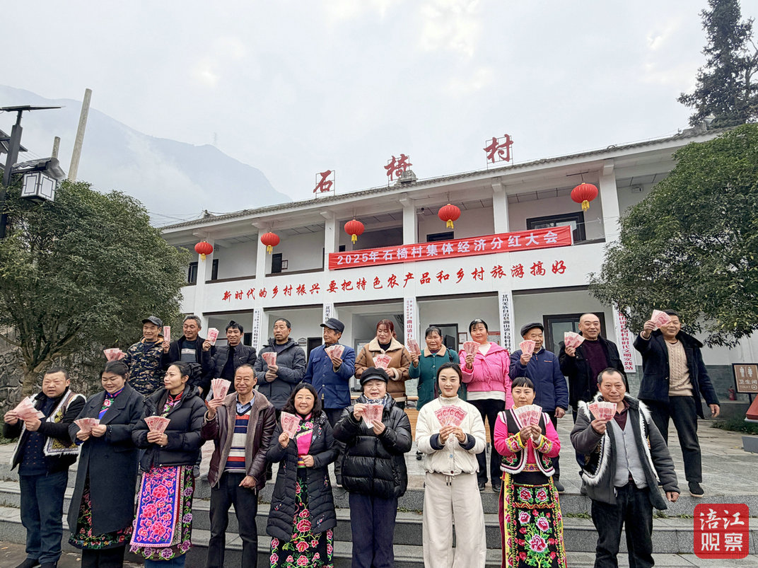 这里正在举行的是石椅村2025年集体经济分红大会。村干部念到名字,村民上前,按下红手印,接过崭新的钞票,脸上绽放出灿烂的笑容。