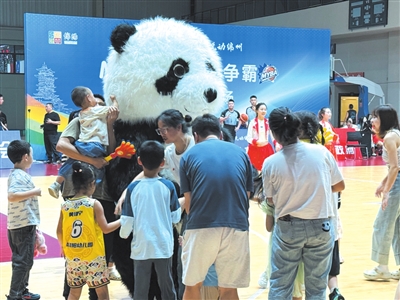 “哇,快看,好大一只大熊猫!”比赛尚未开始,伴随拉拉队热场舞蹈的火热开场,一只巨大的“大熊猫”也从场边蹦蹦跳跳地走向球场。这只高近3米的“大熊猫”像是从漫画里蹦出来的,圆滚滚的肚子随着步伐轻轻晃动,连走路姿势都不自觉地变成了“熊猫摇摆”。别看它体型庞大,活动起来却相当灵活,不仅可以随着音乐的节奏摆出各种造型,还走向观众席张开双臂主动向大家求抱抱,吸引了不少球迷上前围观合影。到了中场休息环节,家长们更是带着孩子将“大熊猫”团团围住,现场气氛十分有趣。