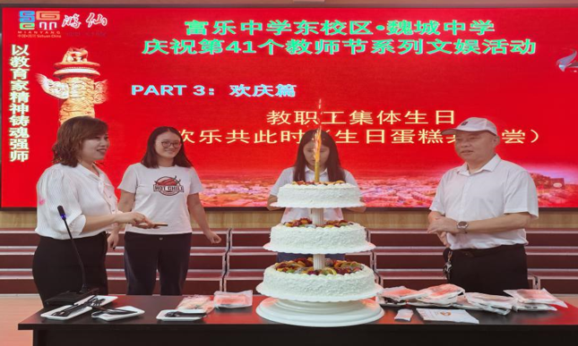 在教职工集体生日环节,该校工会为大家准备了鲜花和精美礼物,老师们齐唱生日歌,共享生日蛋糕,将庆祝活动推向了高潮。