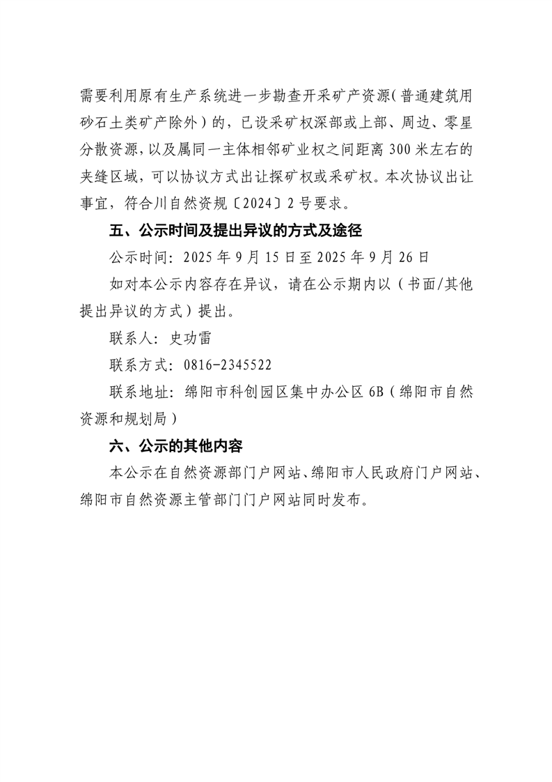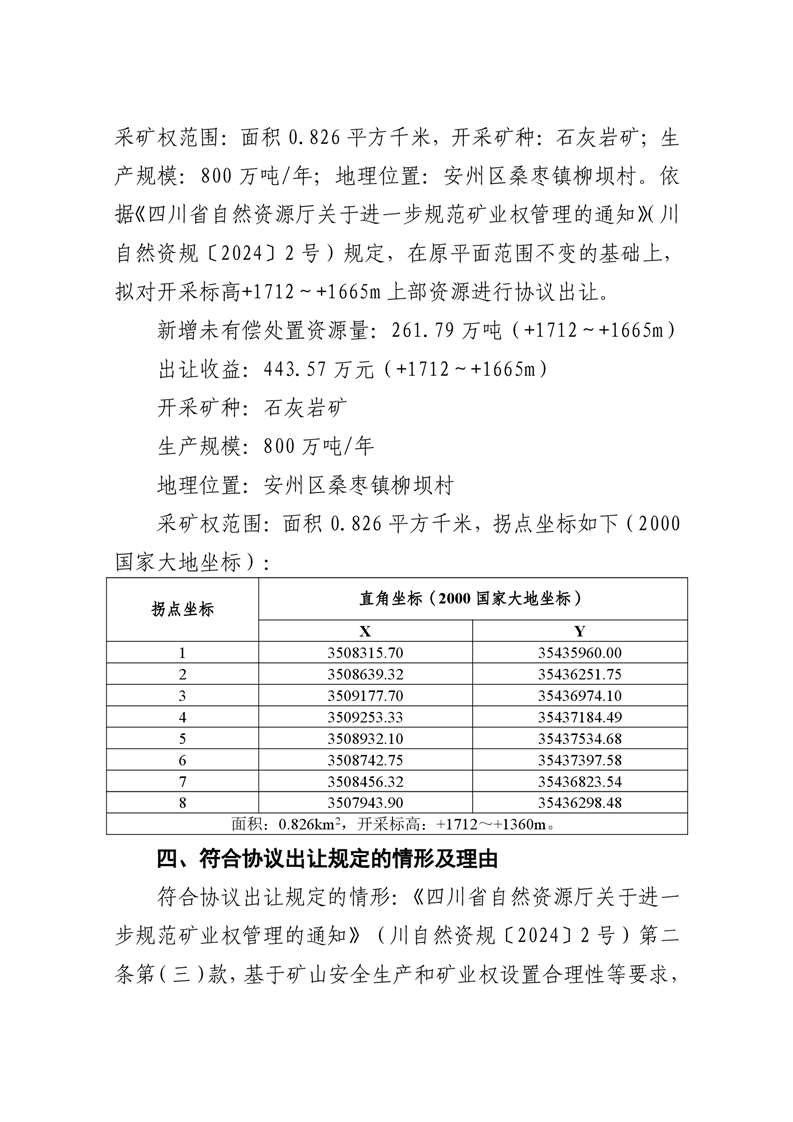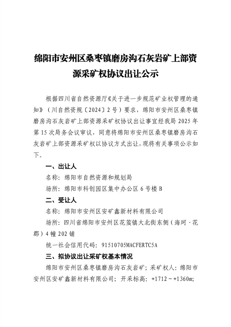 绵阳市安州区桑枣镇磨房沟石灰岩矿上部资源采矿权协议出让公示