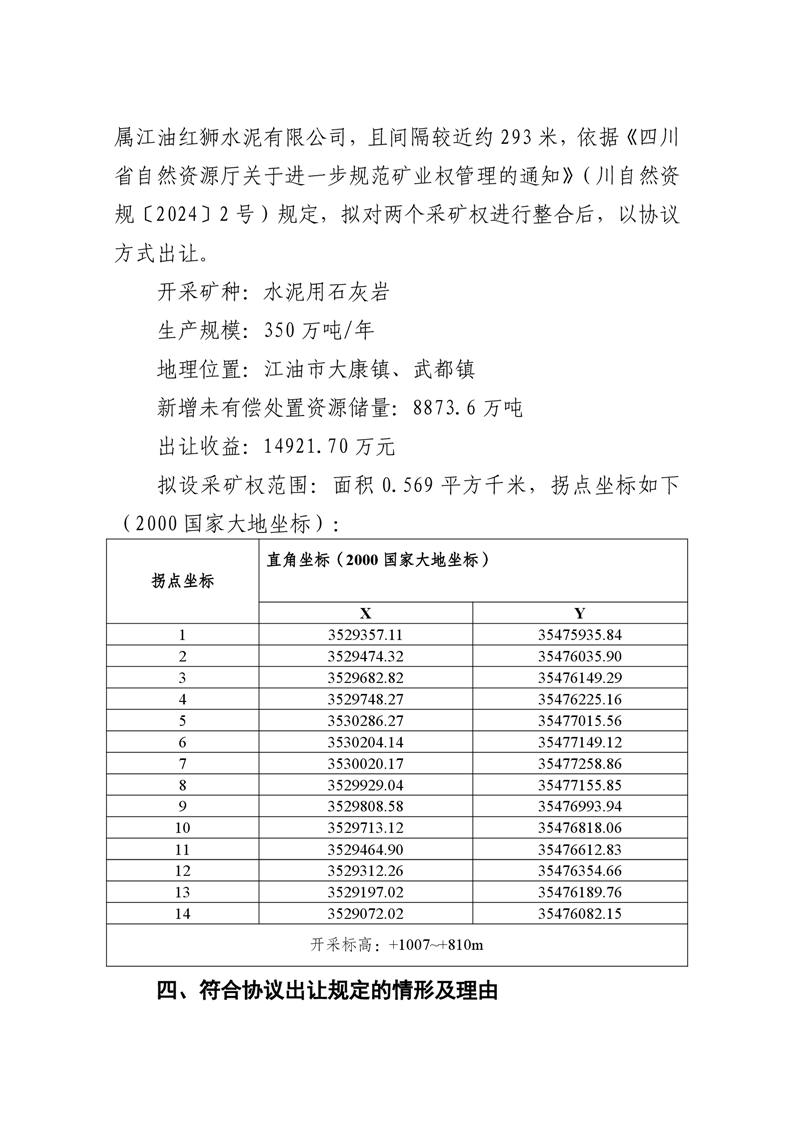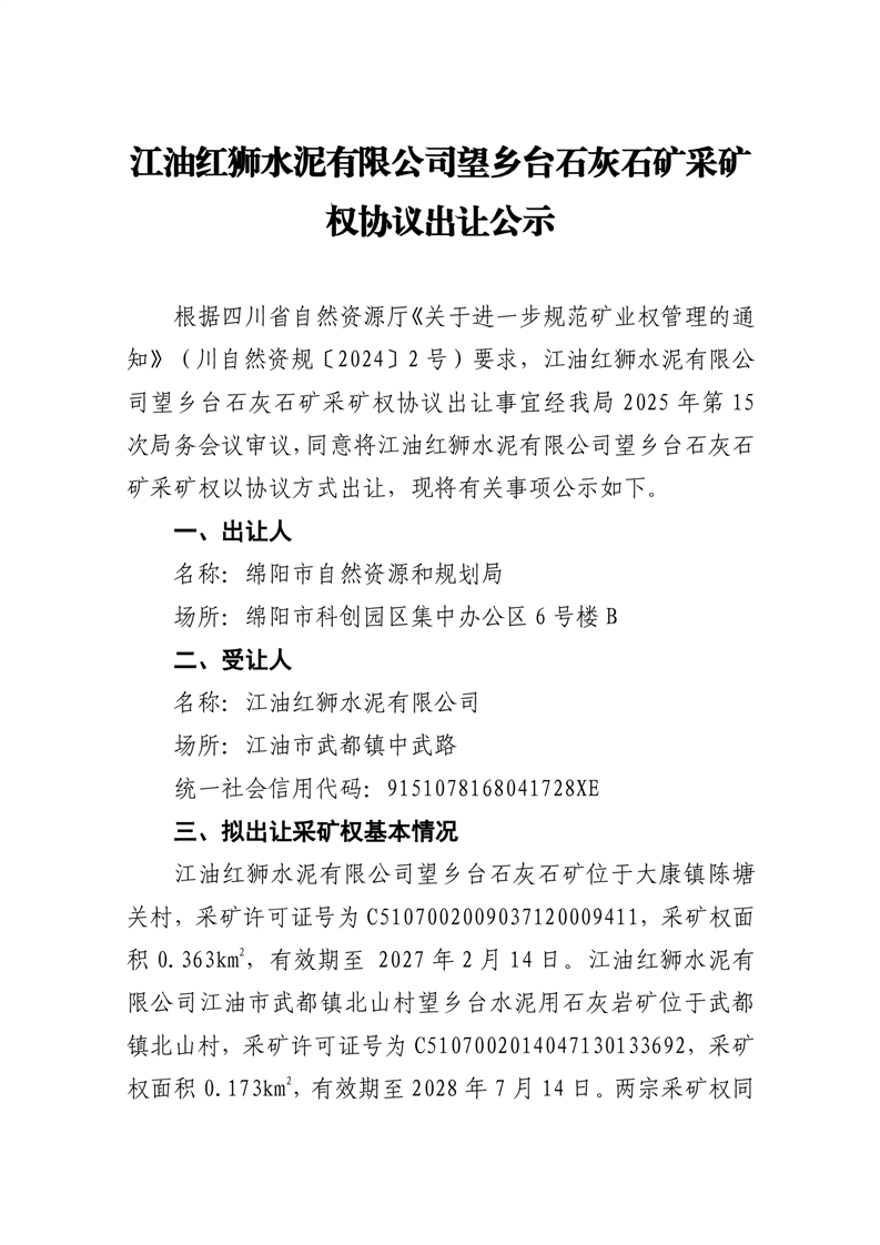 江油红狮水泥有限公司望乡台石灰石矿采矿权协议出让公示