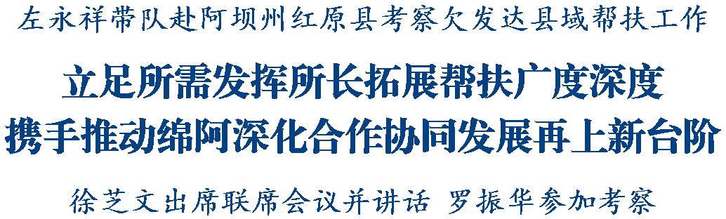 绵阳新闻网讯 9月15日至16日,省委常委、市委书记左永祥带队赴阿坝州红原县考察欠发达县域帮扶工作,看望慰问我市结对帮扶干部人才代表,出席绵阳市结对帮扶阿坝州红原县、壤塘县联席会议并讲话。副省长、阿坝州委书记徐芝文出席联席会议并讲话。