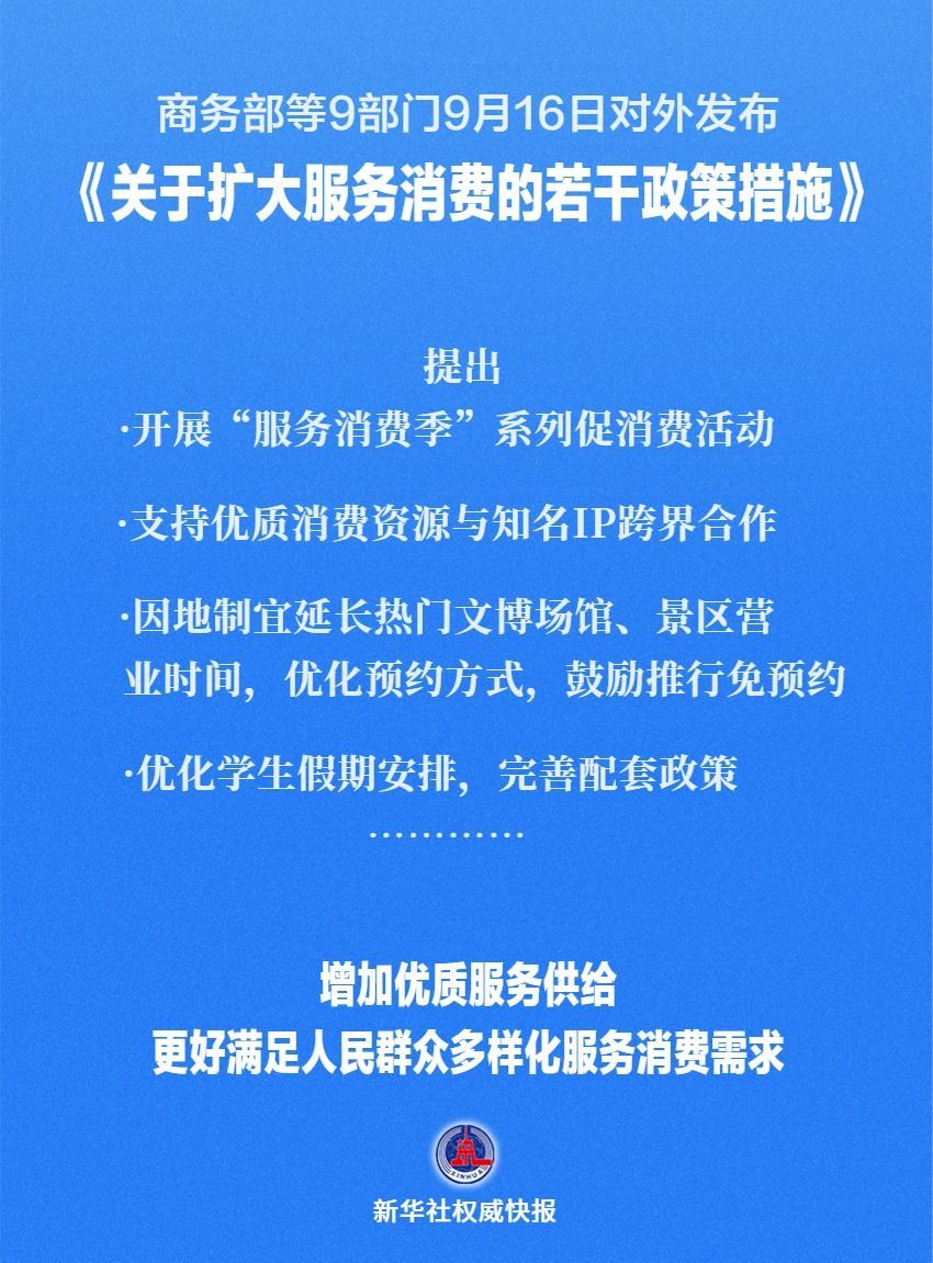 商务部等9部门9月16日对外发布《关于扩大服务消费的若干政策措施》,提出五方面19条举措,包括: