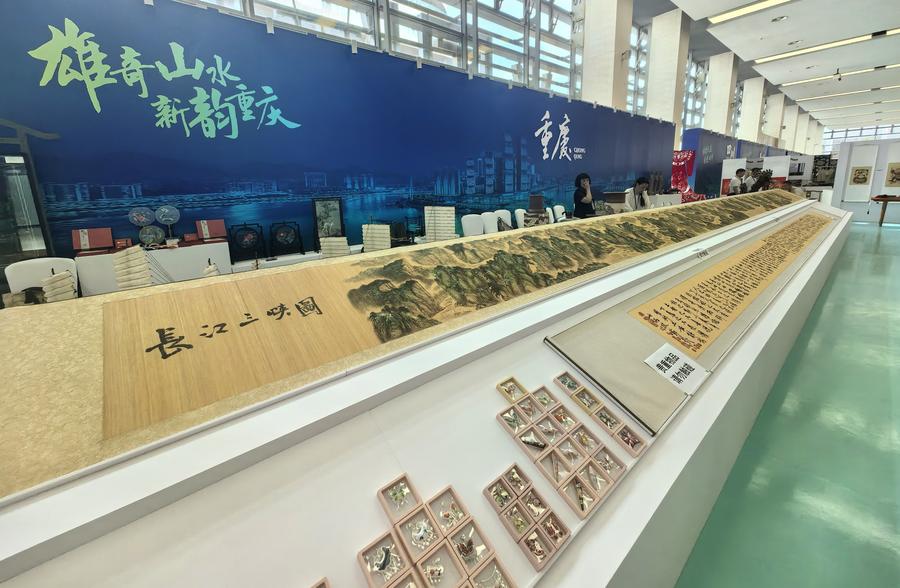 在同日开启的长江流域非遗精品展上,13.98米长的梁平竹帘作品《长江三峡图》展卷长铺,彭水苗绣作品《砥柱铭》书法气韵生动,苗族银饰亮眼夺目,四川蜀锦细腻逼真……展会还邀请了各地传承人,现场展示非遗技艺,让地图上的非遗印记落地可感。