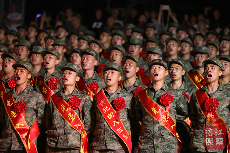 演出结束后,新兵们整齐列队,高唱军歌《当那一天来临》——“准备好了吗,士兵兄弟们,当那一天真的来临……”铿锵有力的歌声回荡在剧场,表达了他们保家卫国、奋勇前进的坚定信念。