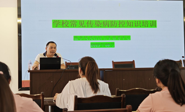 幼儿园卫生副校长顾剑对教职工进行培训。他从学校传染病的特点、传染病基础知识、学校常见传染病防控策略和重点关注的传染病三方面入手本次培训。