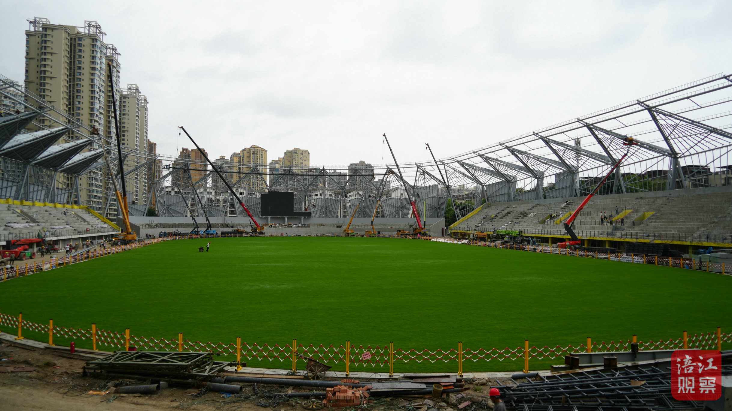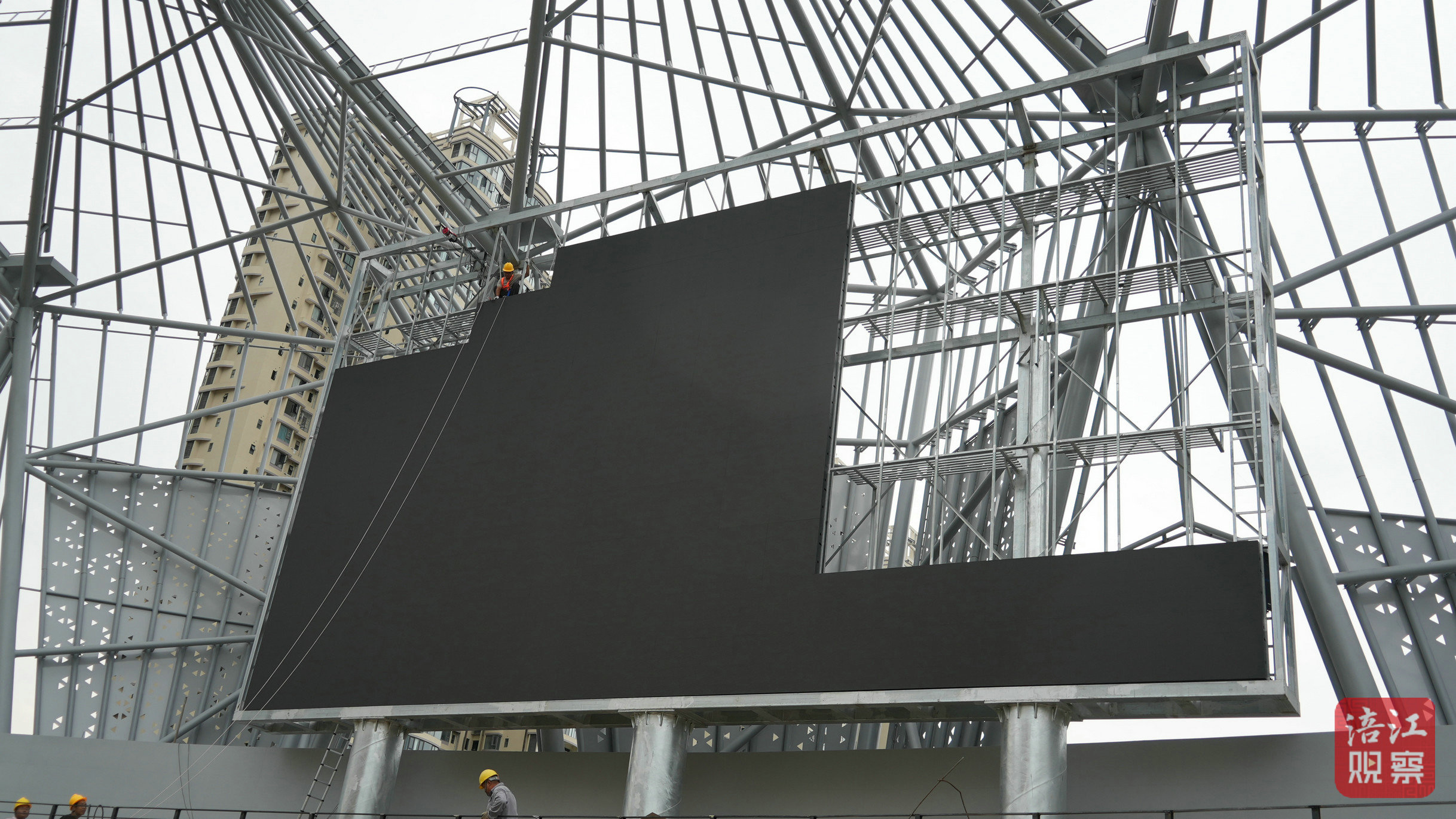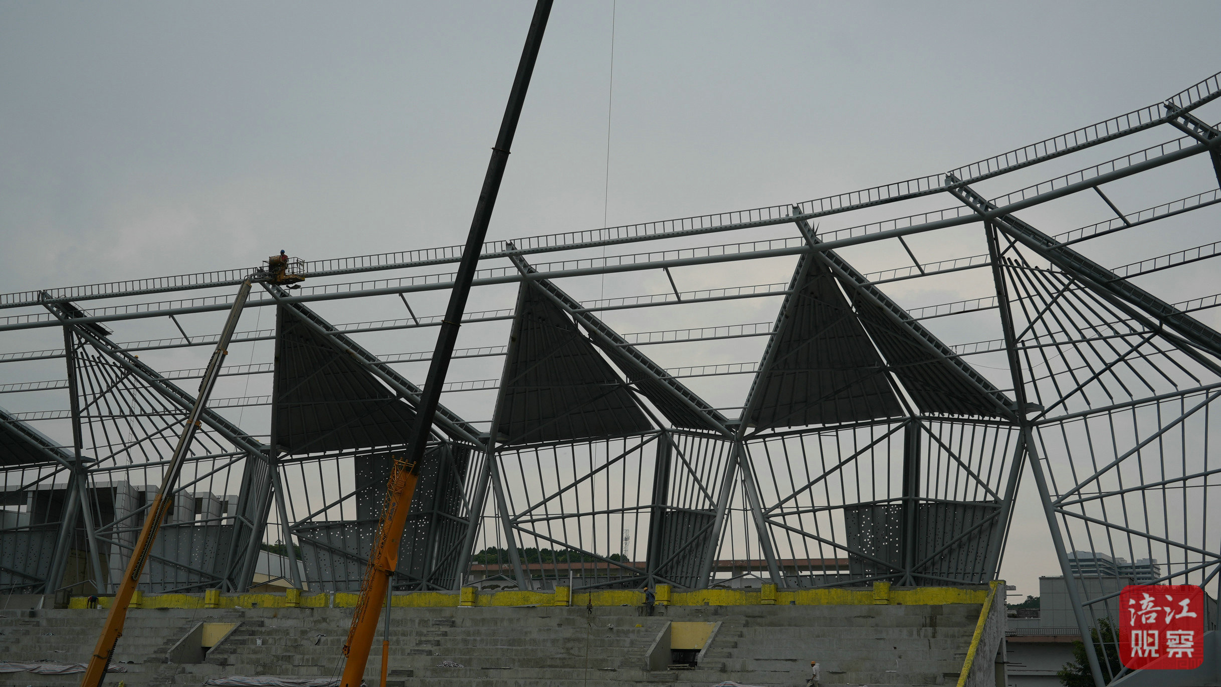 在南看台区域,工人们正在拼贴宽20米、高10.5米、总面积超200平方米的巨大LED屏幕。该LED屏幕计划于本周内完成全部安装并启动通电调试,正式投用后,将承担赛事直播、比分实时展示、赛事信息播报等重要功能,极大提升观众的现场观赛体验。
