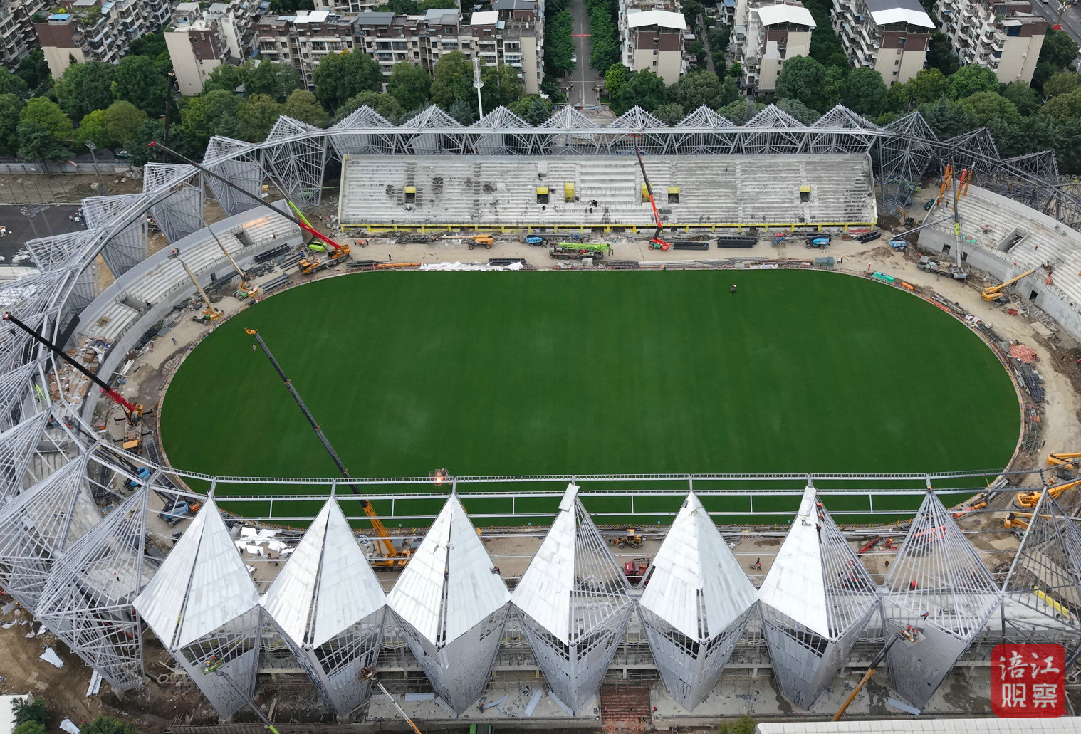 记者在现场看到,上周刚完成草坪铺设的足球场,如今已展现出均匀的碧绿色泽。按照施工计划,本周内将完成球门安装,待球门安装完毕后,施工团队还将对草坪进行二次压平与精细化修剪,随后开展专业的球场划线工作,确保场地符合“川超”比赛的专业要求。