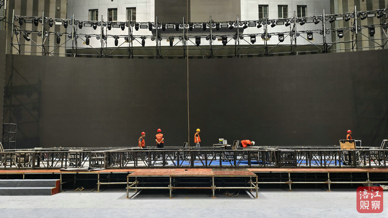 钢琴与人形机器人背后的开幕式主舞台上,巨大的异形主屏幕结构已初具规模,工人们正进行最后的吊顶和异形梯步搭建。绵阳科发会展旅游有限责任公司副总经理张琨向记者透露,预计将于今晚或明日凌晨完成主会场搭建工作。