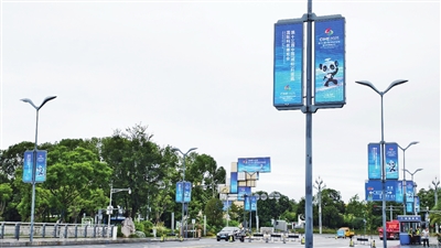 除火炬广场、南郊机场外,富乐山酒店、科发铂骊酒店等重要接待酒店也设置了统一欢迎画面与科技感装置,场馆周边路口也摆放了道路导视牌。50根灯杆上的节能LED动态道旗以醒目方式,指引着这场“从‘科技领航’到‘未来奔赴’的沉浸式体验”的到来。