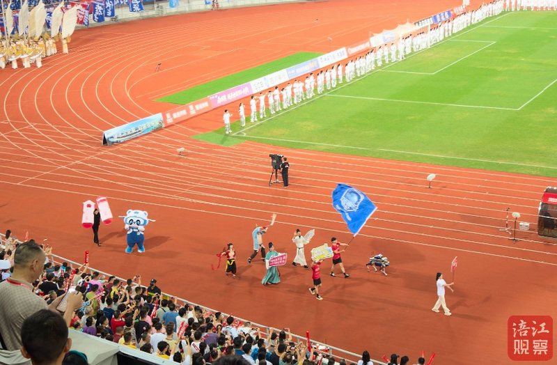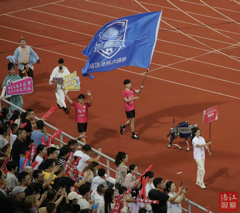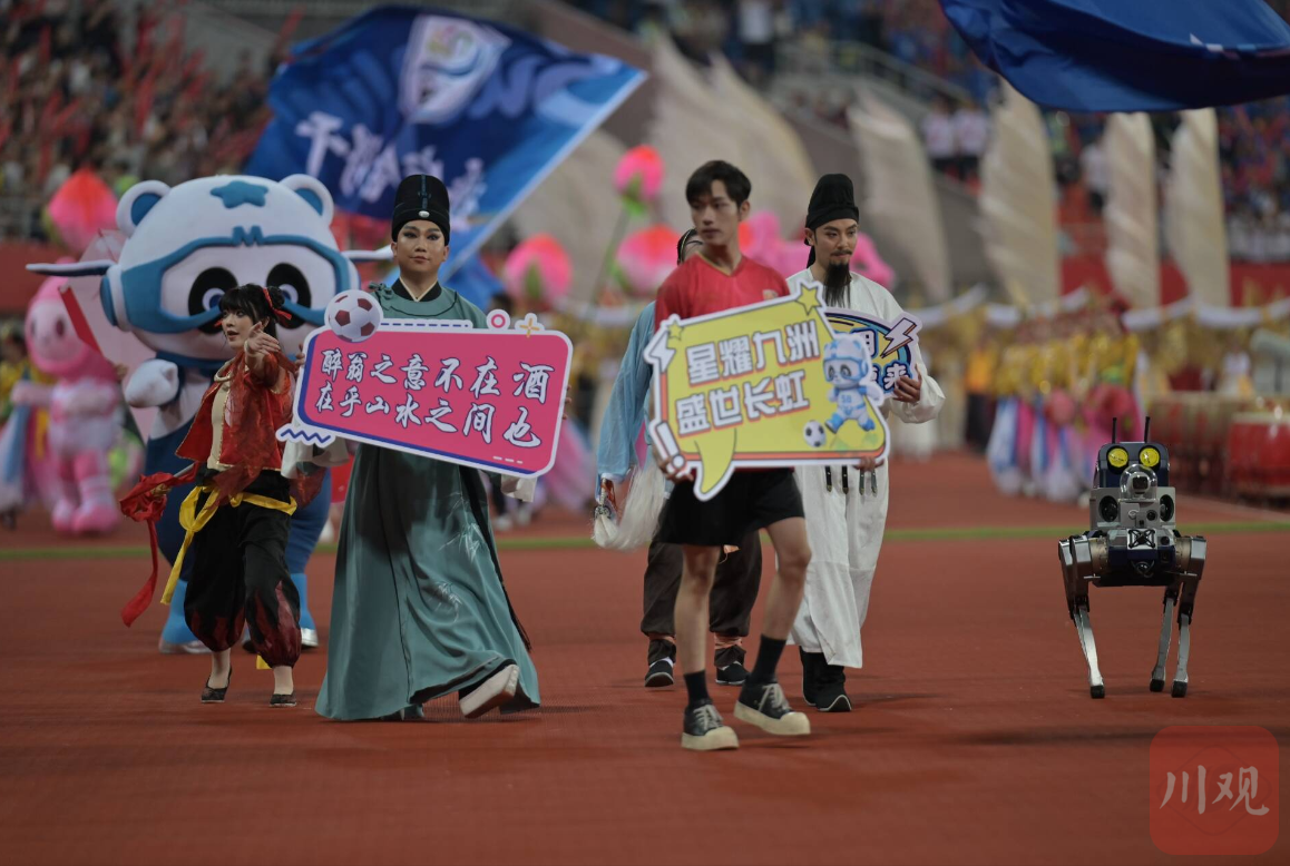 入场完毕后,绵阳特色方队再次呼喊“星耀九洲 盛世长虹”口号,并配合各自角色的标志性动作定格。这一刻,整个球场仿佛被点燃了一般,气氛热烈到了极点。