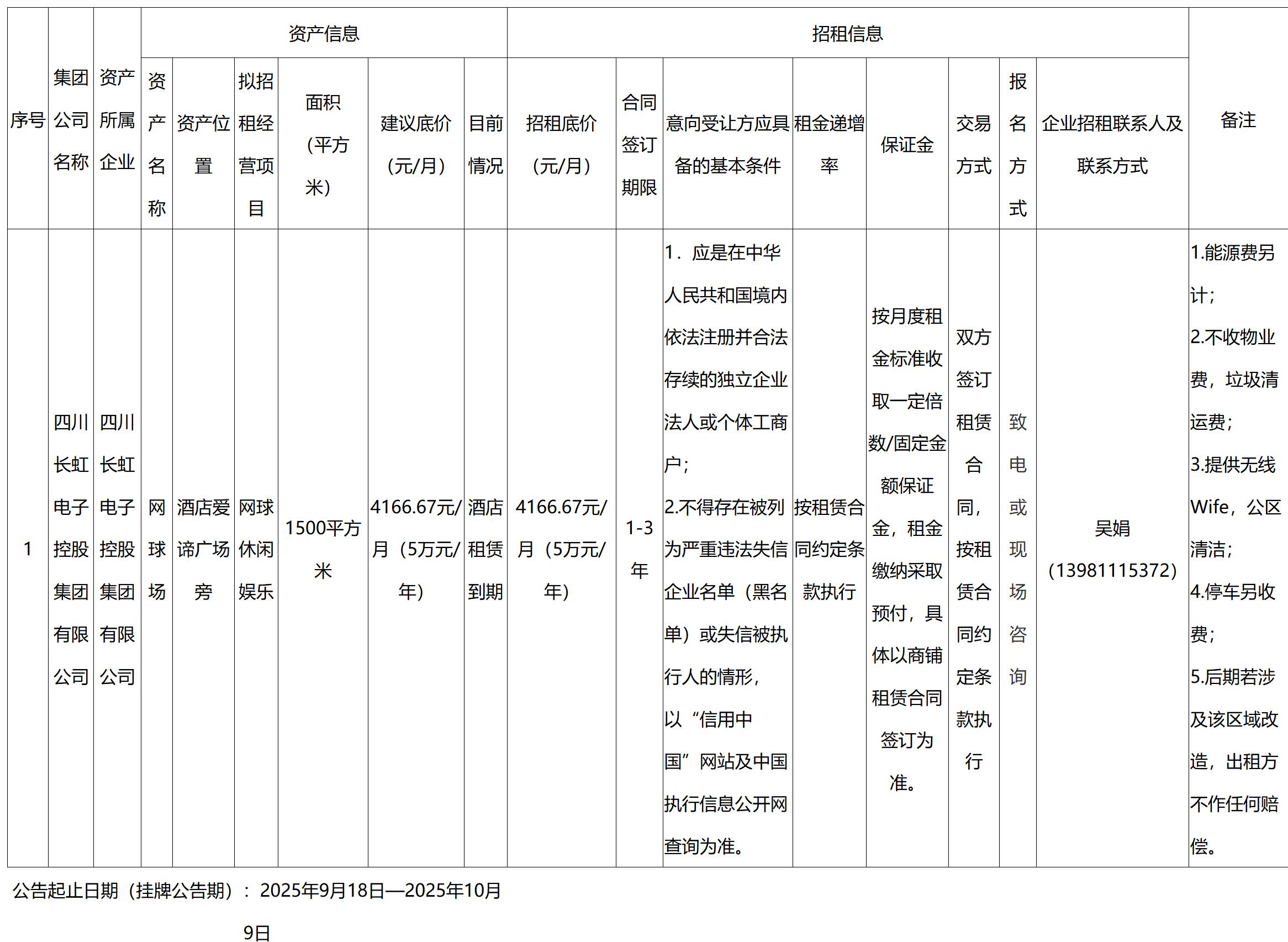 四川长虹国际酒店有限责任公司资产出租公告