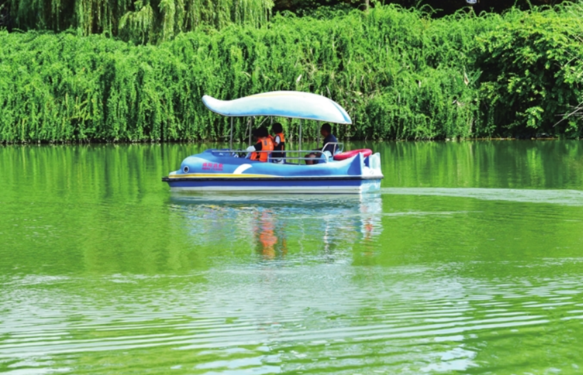 小枧湿地公园,市民乘船游玩。