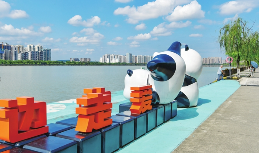 三江河堤上,大熊猫雕塑萌态可掬。