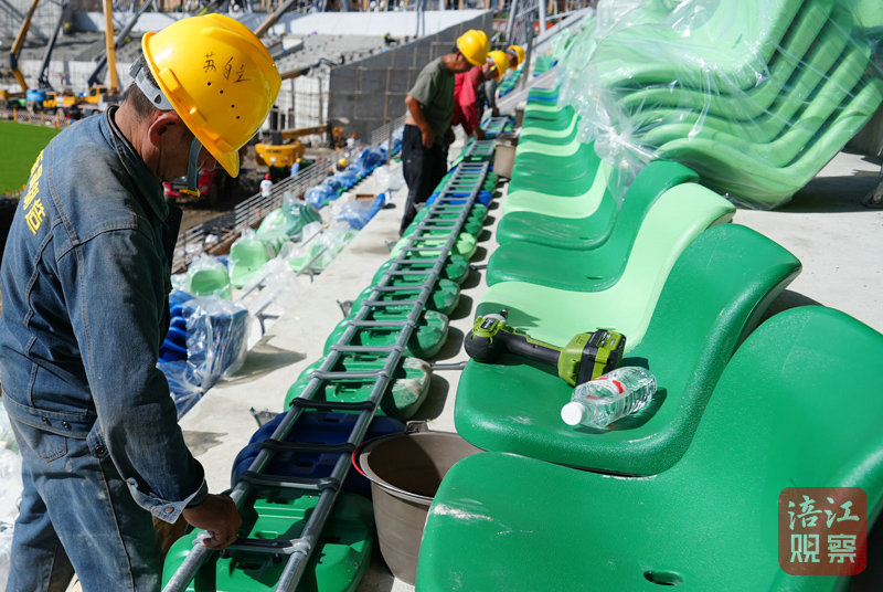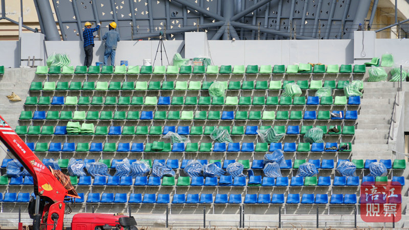 看台区域是当前施工的核心焦点。记者在现场看到,数十名工人分工协作、配合默契,正有条不紊地进行座椅安装作业。据项目负责人介绍,改造后的体育场看台将设置上万个座位,结合三台地域文化与生态特色,座椅选用青蓝、深绿、浅绿三色渐变排布——下层青蓝呼应涪江岸畔的连绵远山,中层深绿象征流淌的涪江江面,上层浅绿则如近岸浅滩,通过色彩层次勾勒出“山水相依”的自然意象,既具视觉美感,又蕴含本土韵味。