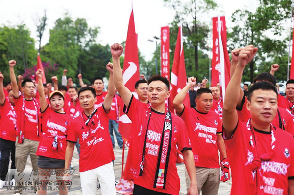 200余名球迷联盟成员身着红色助威服,挥舞队旗齐声高呼“绵阳九洲长虹队,雄起!雄起!雄起!”