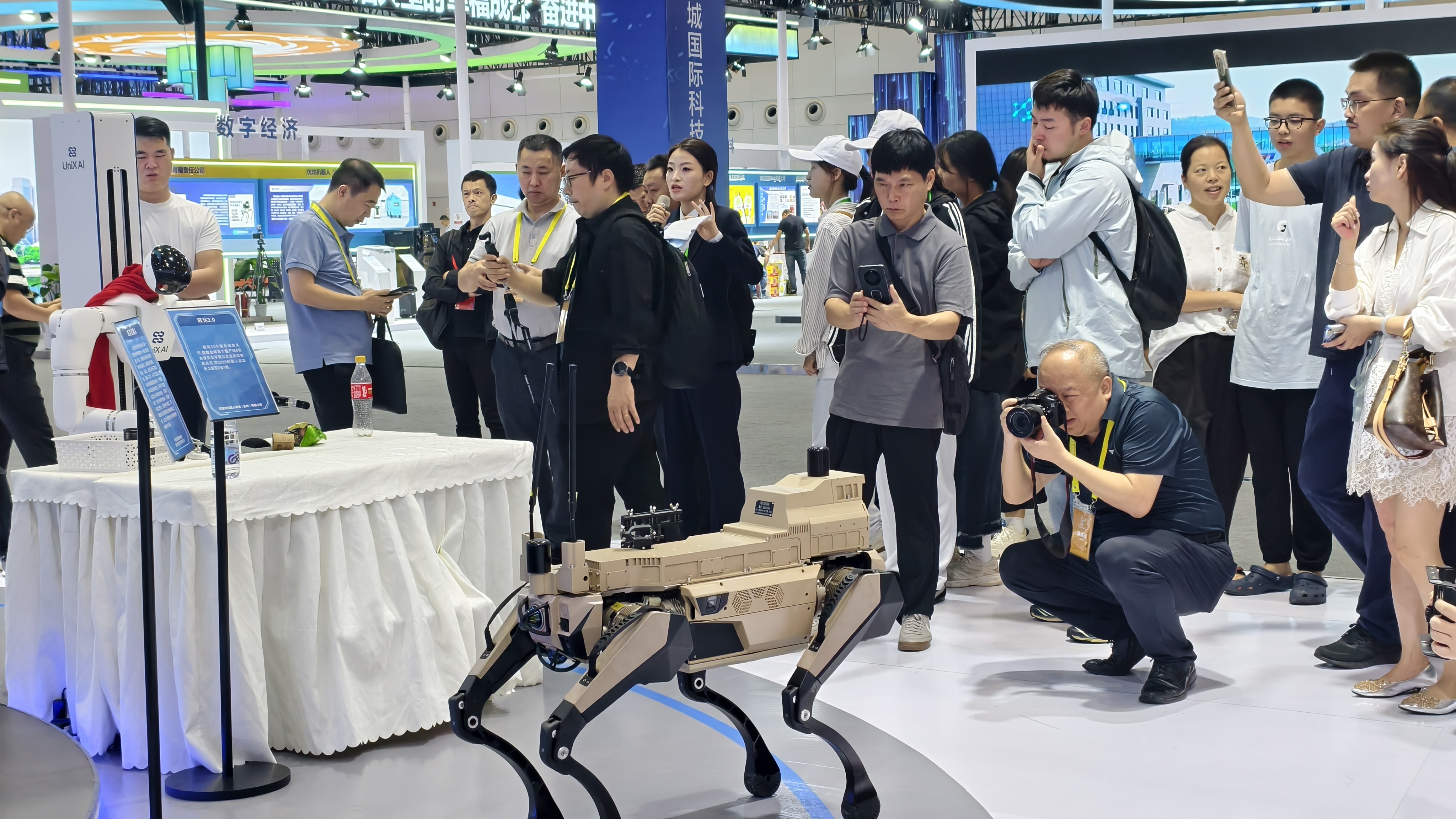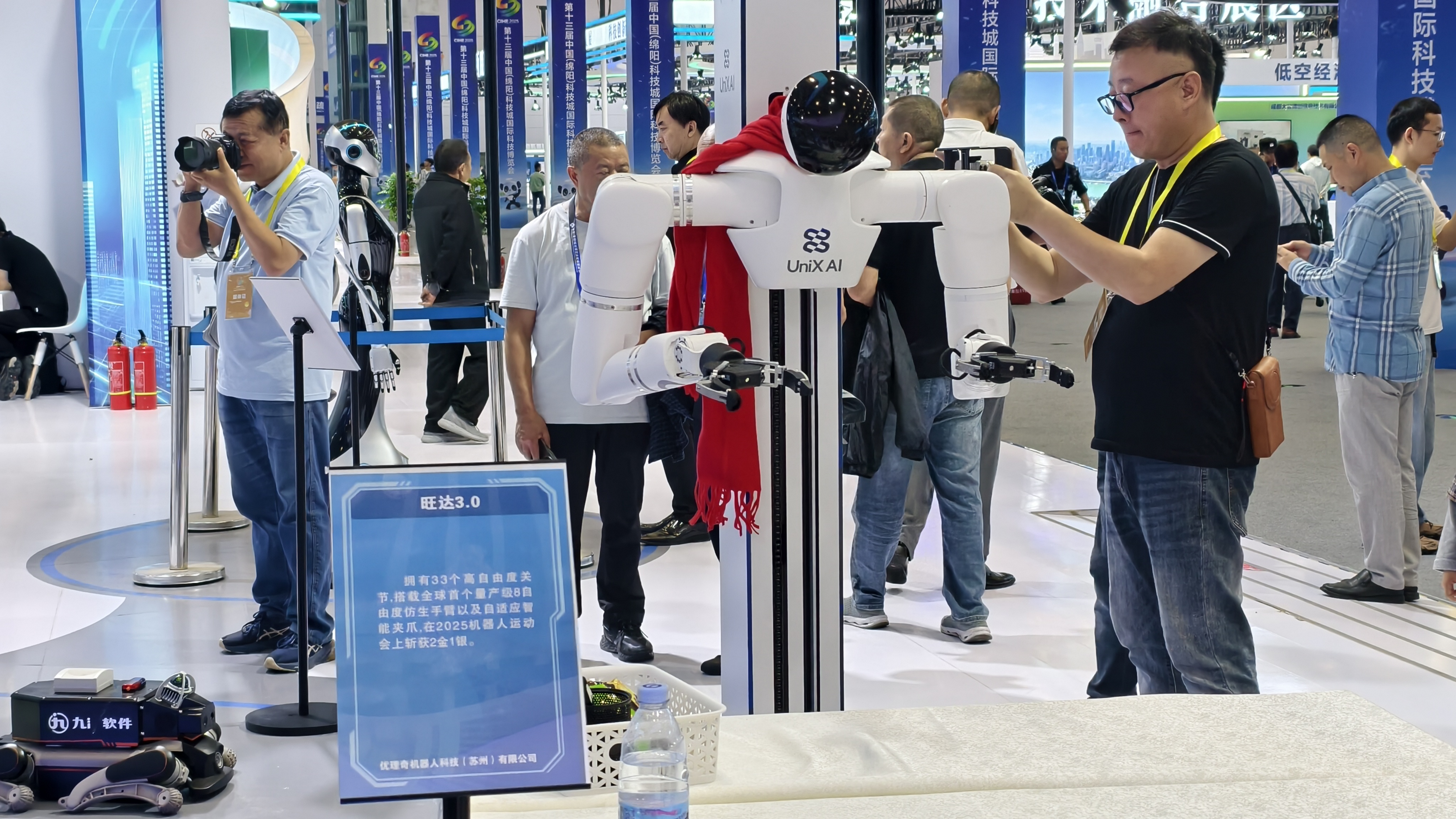 此外,“低空智行”运营服务平台、四足机器人、旺达3.0机器人、长虹灵曦人形机器人、九洲无人机防控指挥车等前沿展品更是成为焦点,引得媒体记者纷纷拍照留念。