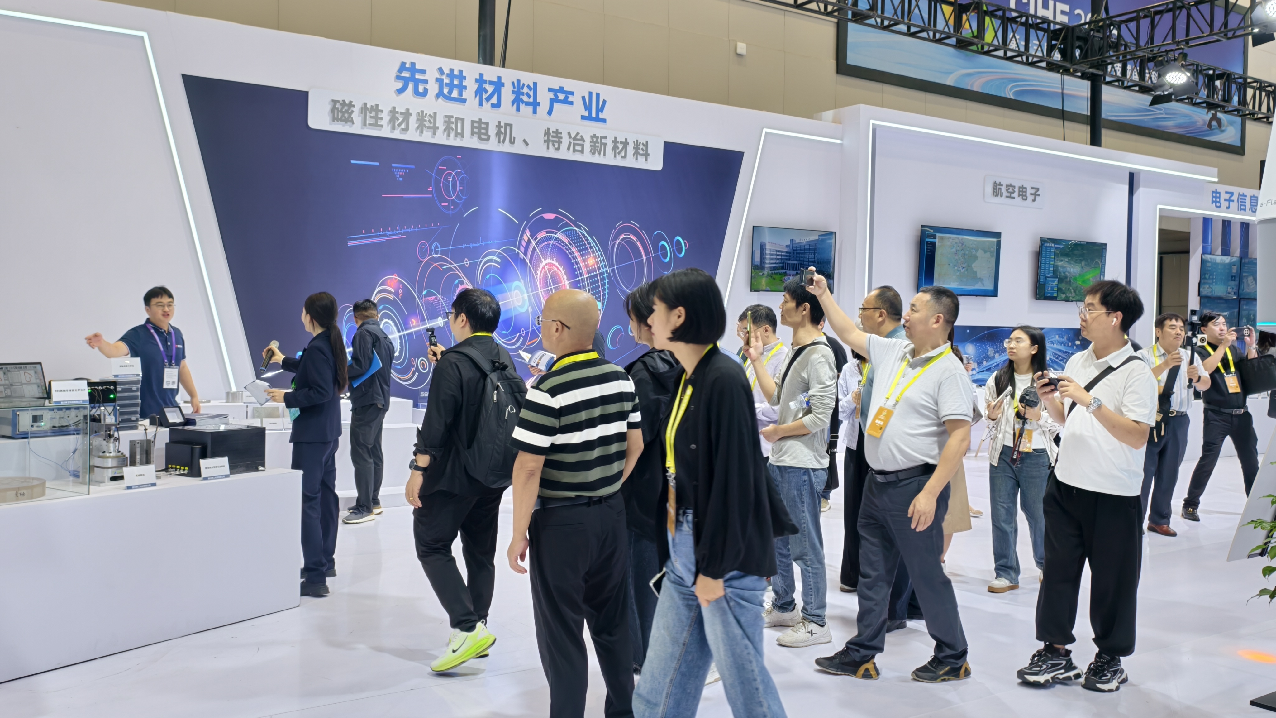 众多媒体记者围绕在e-Flash超高剂量率电子射线放射治疗系统前,仔细聆听讲解。磁性材料和电机、特冶新材料等展品也吸引了大量记者驻足交流。