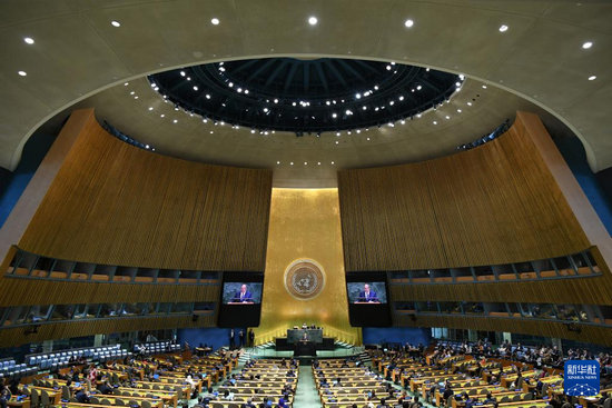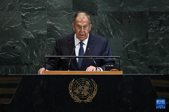 9月27日,在位于纽约的联合国总部,俄罗斯外交部长拉夫罗夫在第80届联合国大会一般性辩论上发言。新华社记者 李睿 摄