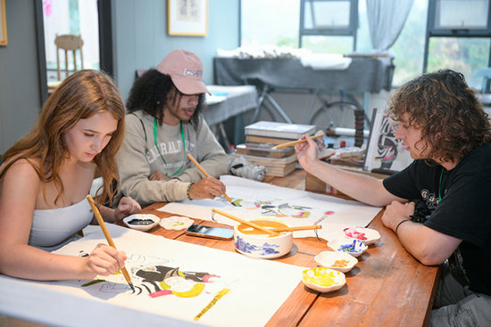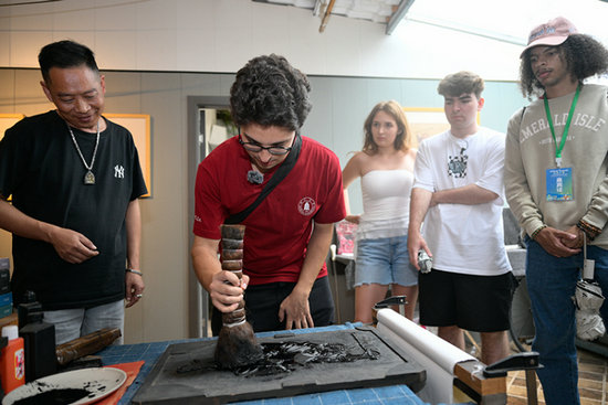 大家在工作室主理人欧阳才俊的指导下,体验拓印和上色的奇妙过程:铺纸、按压、施墨,每一个步骤都做得一丝不苟。来自俄罗斯的伟亚一边体验上色一边说道:“我现在感觉很放松,画画的时候特别平静。”