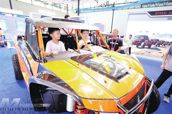9月28日,在第十三届中国(绵阳)科博会上,小观众体验全地形越野车。
