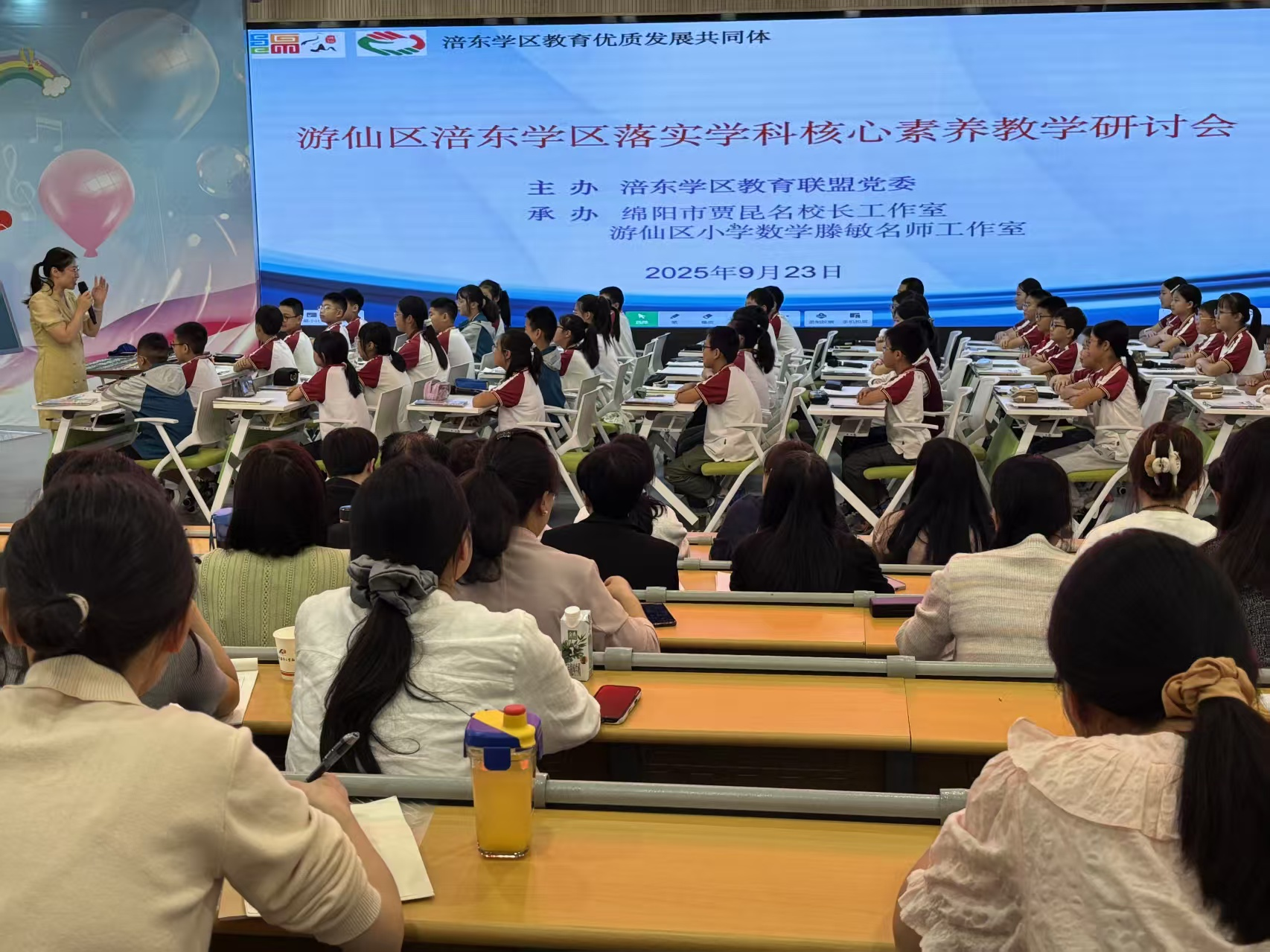 9月23日下午,游仙区涪东学区联合“绵阳市贾昆名校长工作室”“游仙区小学数学滕敏名师工作室”,在绵阳市富乐第二实验小学共同开展“落实学科核心素养”小学数学教学研讨活动。市、区教研员,涪东学区各校数学教师代表、两个工作室成员及富乐实验小学数学组全体教师参会,活动由富乐实验小学副校长滕敏主持。