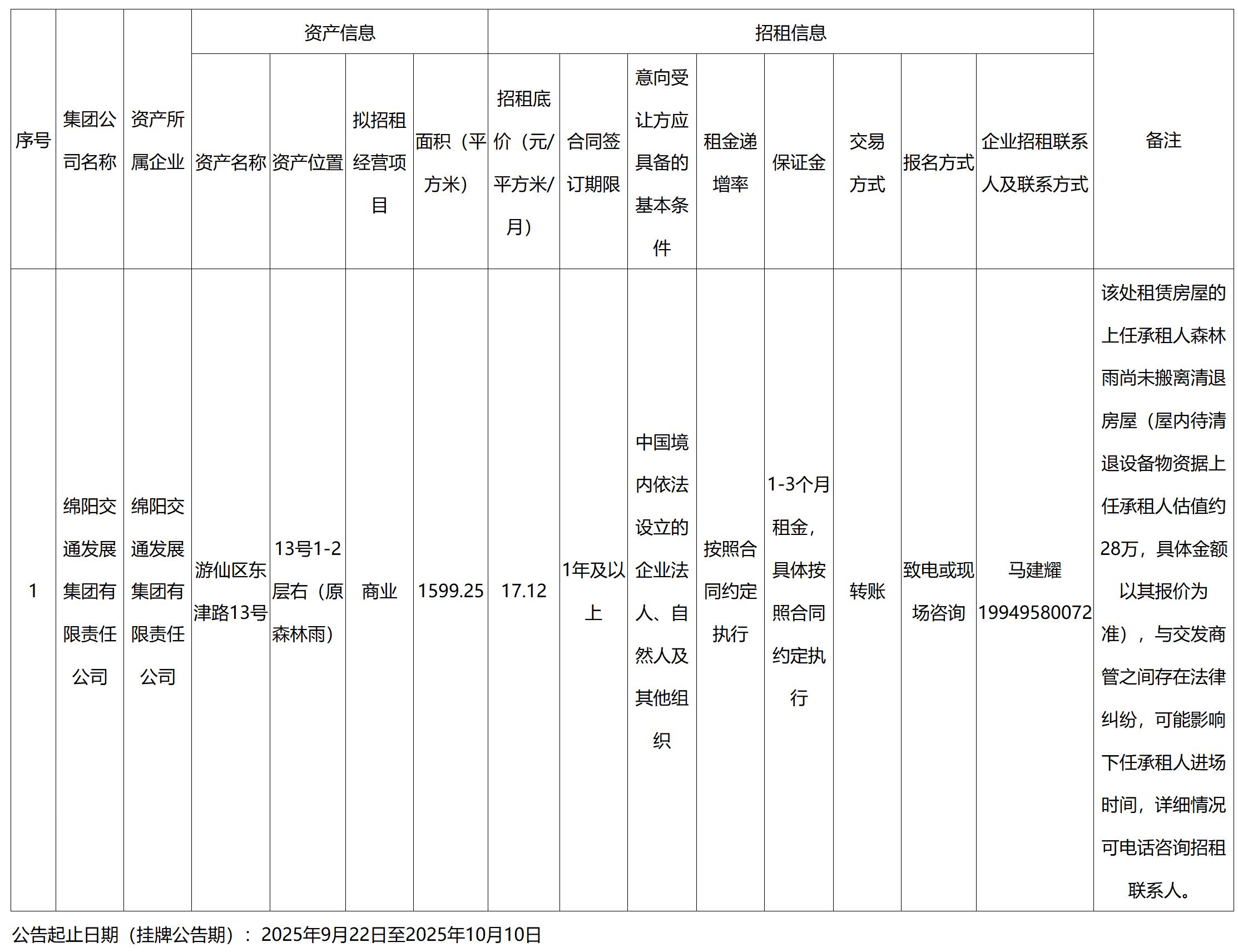 绵阳交发实业有限责任公司游仙区东津路13号资产招租公告