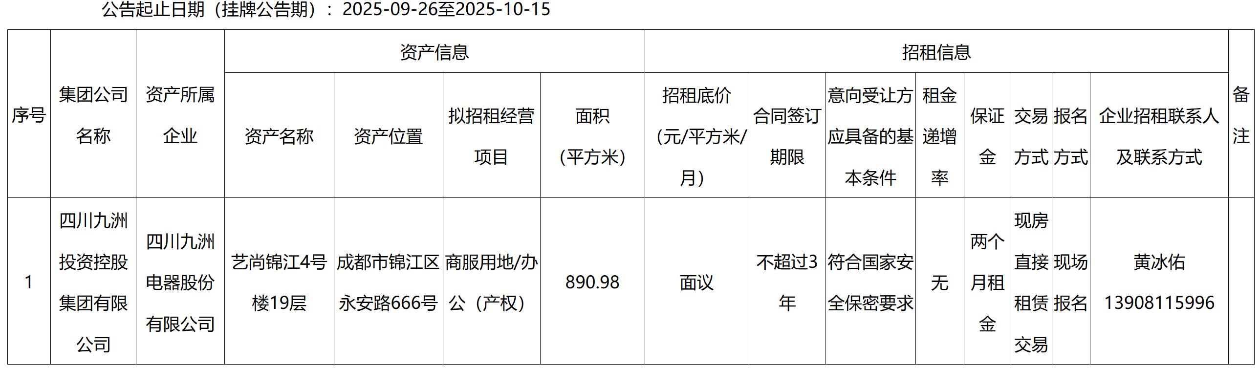 四川九洲千城商业管理有限公司成都项目部艺尚锦江4#楼房屋出租公告