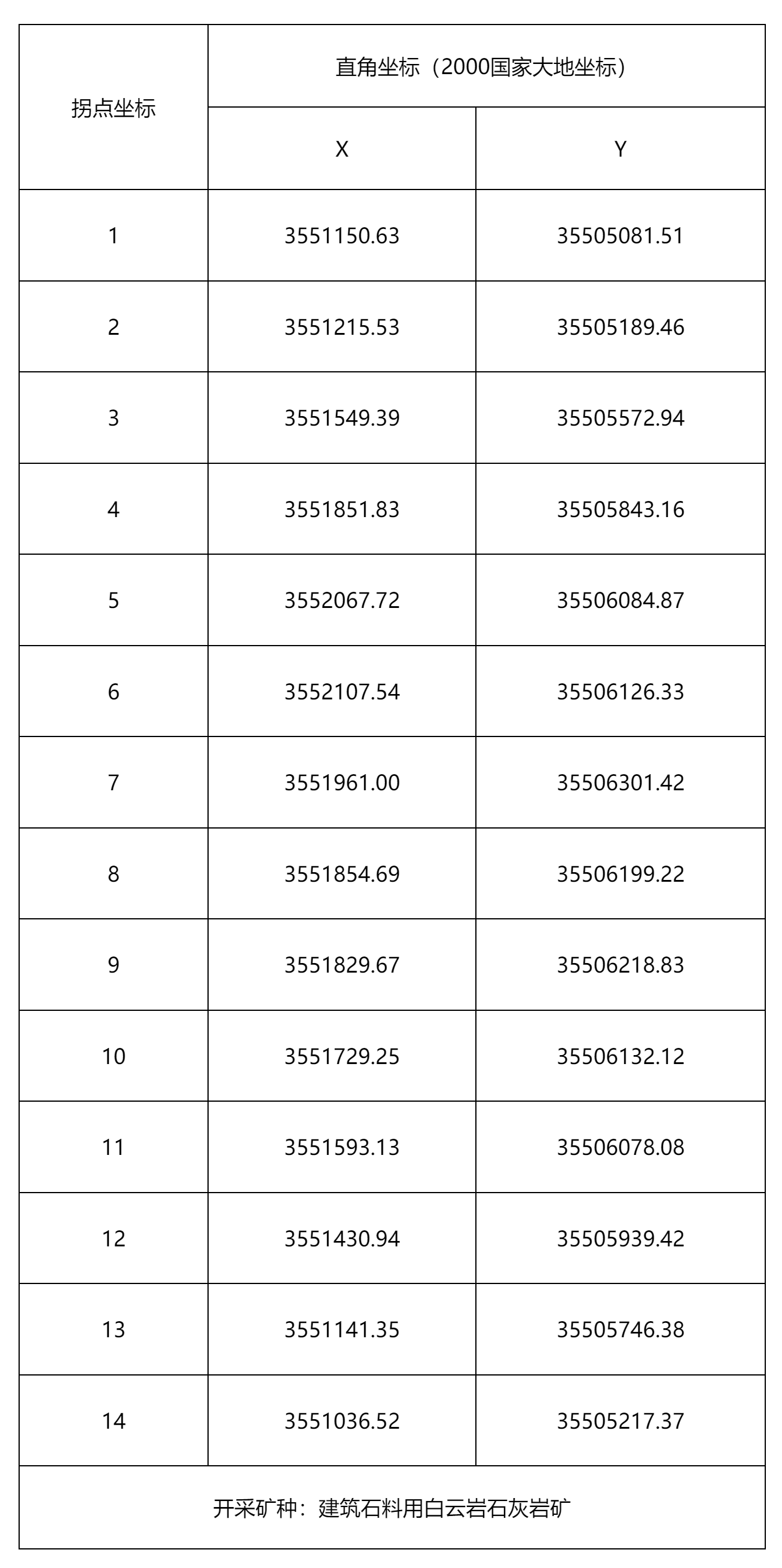 由14个拐点坐标圈闭(见下表),矿区总面积:0.448平方公里,开采标高:+1029m至+825m