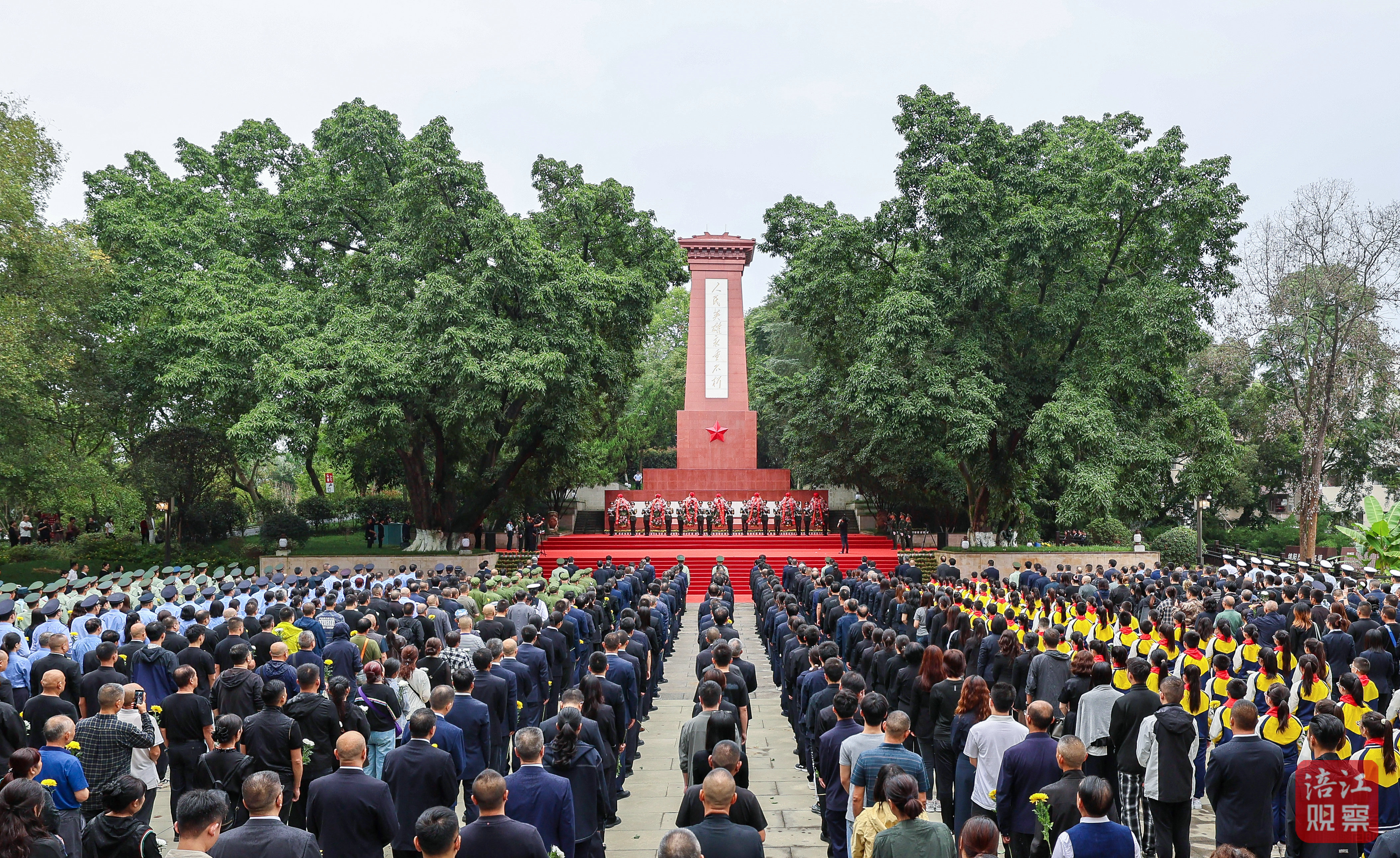 云幕低垂,细雨霏霏,绵阳烈士陵园内,松柏苍翠、庄严肃穆,革命烈士纪念碑巍然耸立。9时30分许,向人民英雄敬献花篮仪式正式开始,礼兵迈着铿锵有力的步伐,分两列正步行进到纪念碑两侧整齐伫立。在雄壮的《义勇军进行曲》中,全场齐声高唱中华人民共和国国歌。国歌唱毕,全场肃立,向烈士默哀。随后,少先队员们齐唱《我们是共产主义接班人》,用嘹亮的歌声表达新时代少年沿着先烈足迹勇敢前进的远大志向。