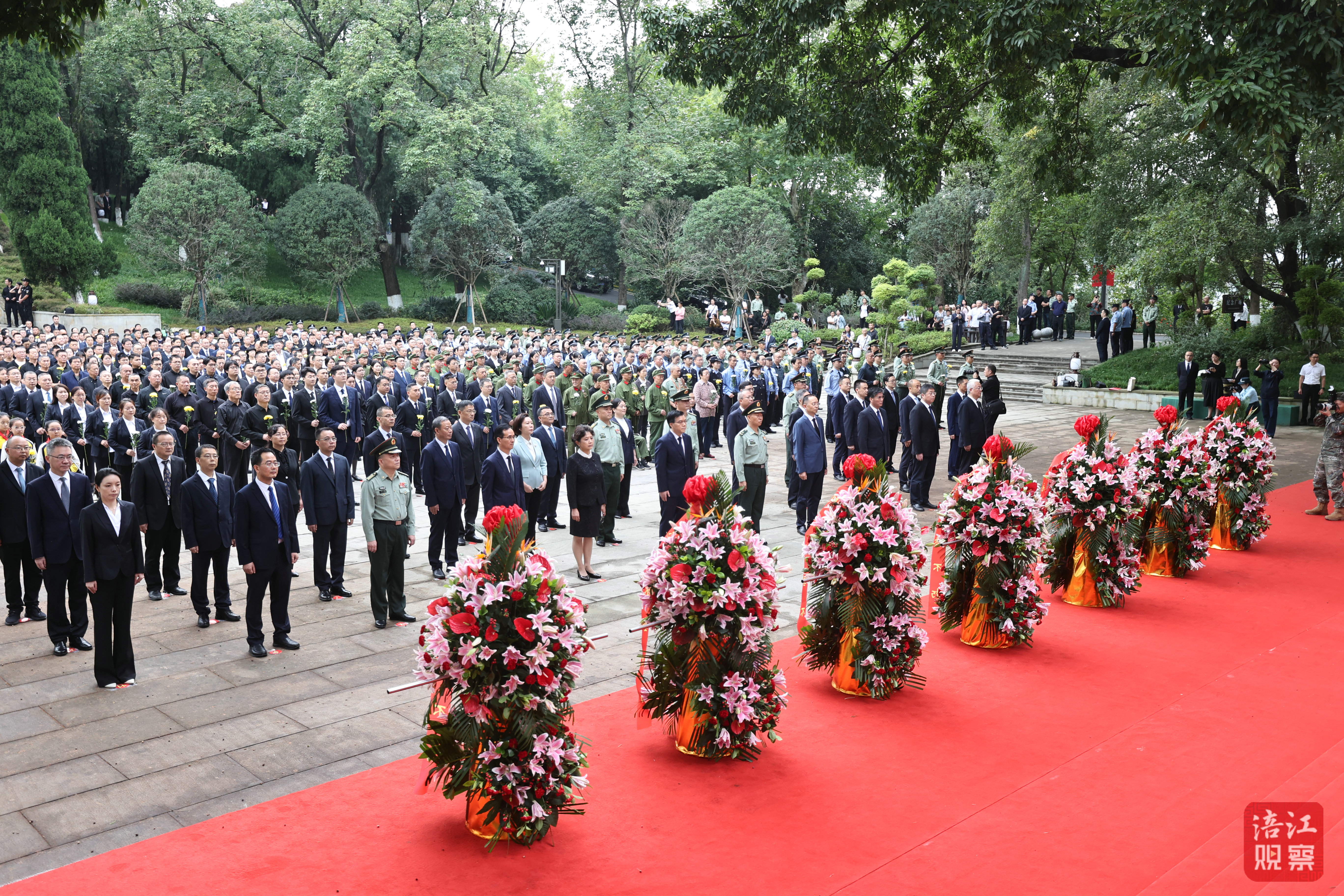 队列方阵前,由市委、市人大常委会、市政府、市政协、驻绵解放军和武警部队、涪城区委区政府和人民团体及各界群众、烈士遗属和老战士及退役军人敬献的7个花篮一字排开,花篮红色缎带上“烈士永垂不朽”6个大字庄重而醒目。伴随着深情的《献花曲》,14名礼兵抬起花篮,正步向前,拾阶而上,将花篮轻轻摆放在烈士纪念碑前。