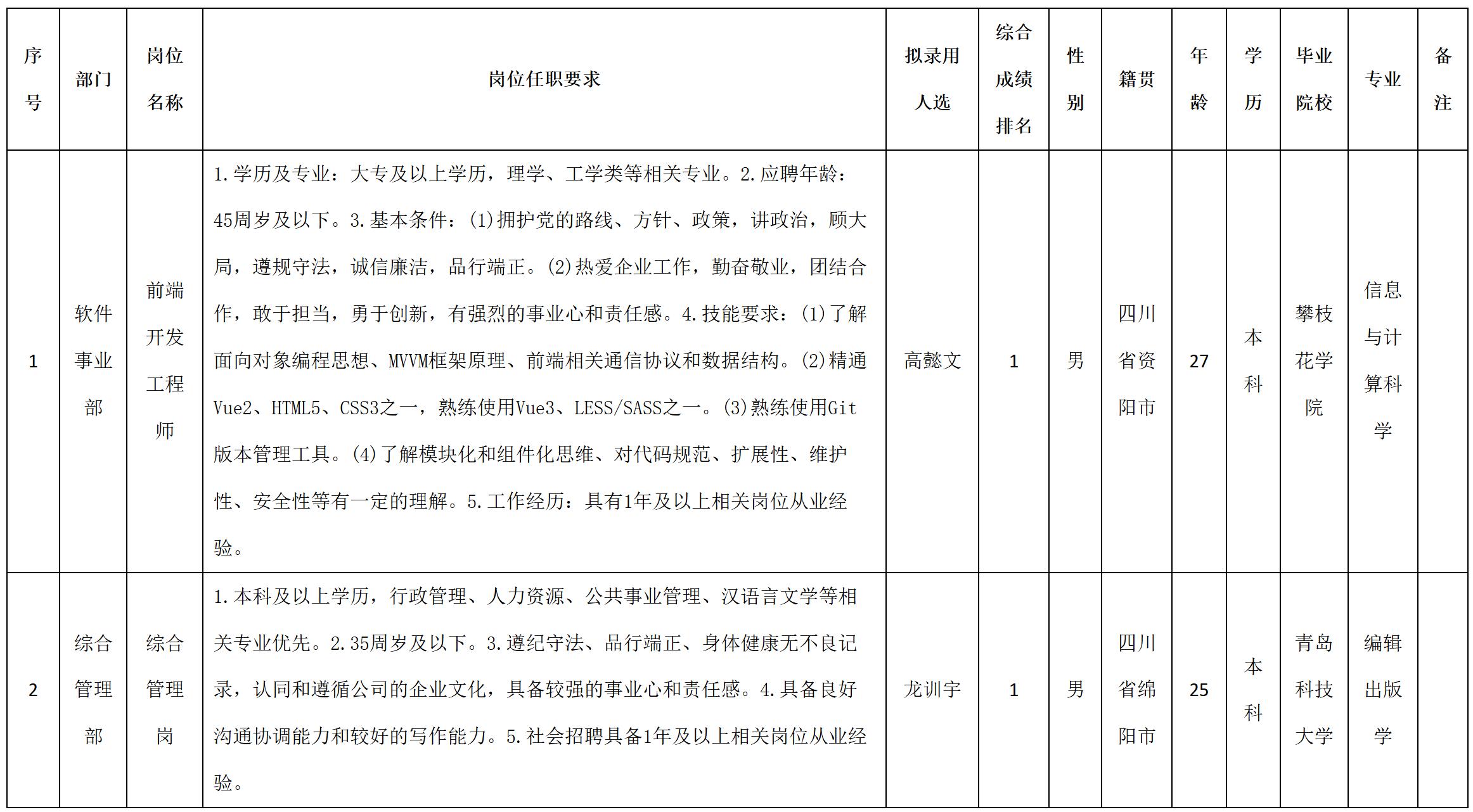 根据四川九强通信科技有限公司发布的招聘公告及招聘相关规定,经测试、考察、体检等程序,拟录用高懿文等2名同志到四川九强通信科技有限公司工作,现予以公示,具体情况如下: