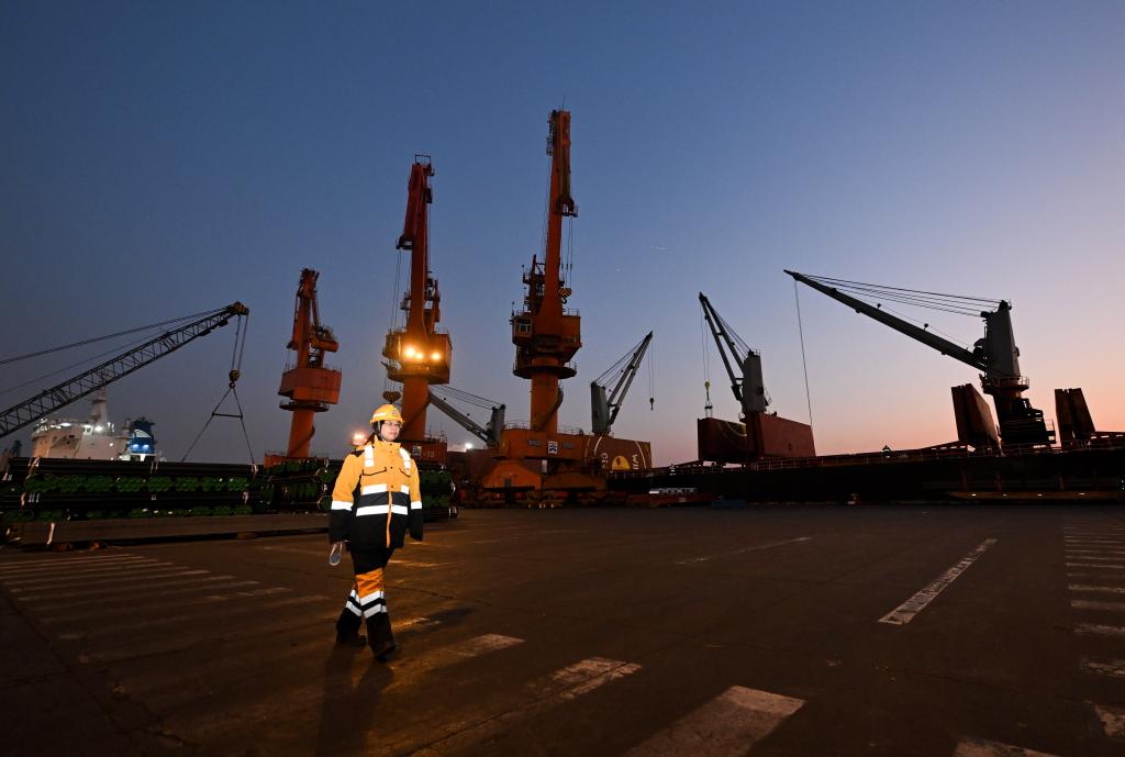 新华社天津1月3日电(记者赵子硕)冬日里,渤海湾畔寒风凛冽,寒意穿透衣物,直刺肌肤。当这座城市的人们仍沉浸在新年假期中时,天津港第一港埠有限公司的码头上,早已是岸桥轰鸣、车辆穿梭,一片繁忙。