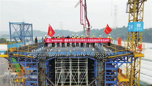 绵阳新闻网讯 近日,由蜀道铁路投资集团主导投资、中建八局承建的绵遂资内铁路绵遂段关键节点——位于绵阳市丰谷镇的青水堰特大桥,其连续梁主墩0号块顺利完成浇筑,较原计划提前整整30天。