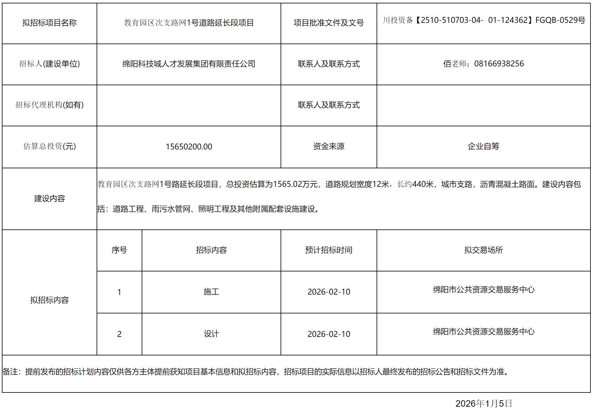 教育园区次支路网1号道路延长段项目招标计划公告