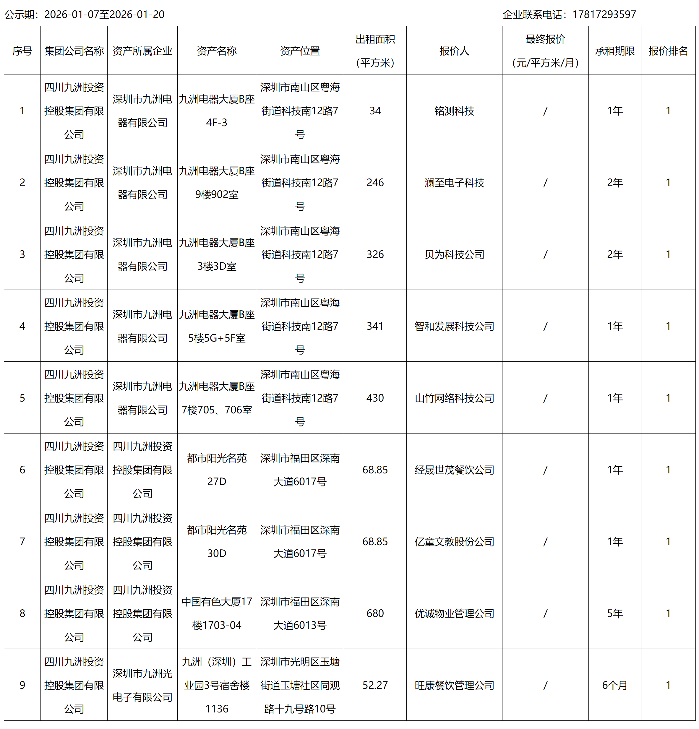 深圳市九洲光电子有限公司九洲电器大厦、都市阳光名苑、中国有色大厦、九洲工业园房屋出租结果公示