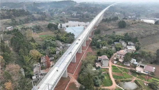 成渝中线高铁跨成都东西轴线大道特大桥施工现场,混凝土泵车长臂舒展,施工人员正精准浇筑Ⅲ型板式无砟轨道,毫米级的精度把控为350公里时速的通行安全筑牢根基;不远处的蜀安隧道内,“成渝号”盾构机仍在掘进最后400余米,为全线隧道贯通冲刺。